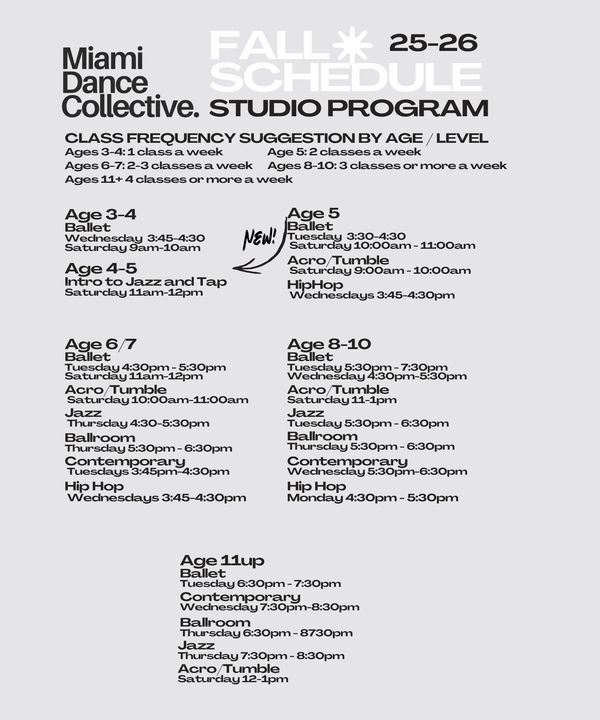 Our goal is that each student experience invaluable life lessons as they grow in an artistic environment. No matter the dancers age or level, there is a place for everyone at Miami Dance Collective! The Studio Program offers a technique-focused program for recreational dancers ages toddler through teen. With our amazing faculty and state-of-the-art facility, we are confident that every child will enjoy learning ballet, jazz, contemporary, hip hop, and creative movement.